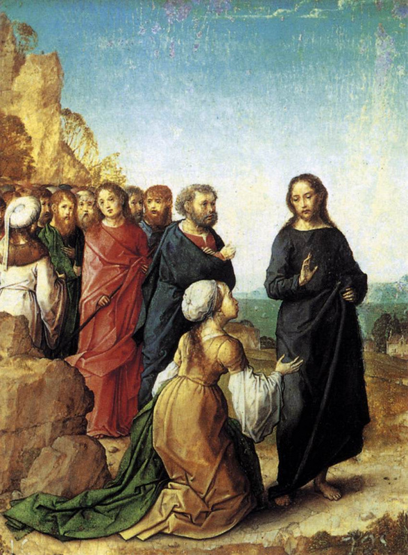 Juan, de Flandes, approximately 1465-1519. The Canaanite Woman asks for healing for her daughter, from Art in the Christian Tradition, a project of the Vanderbilt Divinity Library, Nashville, TN. https://diglib.library.vanderbilt.edu/act-imagelink.pl?RC=55921 [retrieved August 20, 2023]. Original source: http://commons.wikimedia.org/wiki/File:Juan_de_Flandes_-_Christ_and_the_Canaanite_Woman_-_WGA12050.jpg.