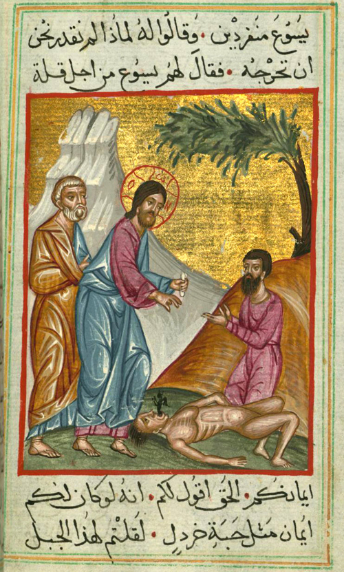 Jesus Heals a Demon-possessed Boy, from Art in the Christian Tradition, a project of the Vanderbilt Divinity Library, Nashville, TN. https://diglib.library.vanderbilt.edu/act-imagelink.pl?RC=56409 [retrieved February 3, 2024]. Original source: https://commons.wikimedia.org/wiki/File:Ilyas_Basim_Khuri_Bazzi_Rahib_-_Jesus_Heals_a_Demon-possessed_Boy_-_Walters_W59248B_-_Full_Page.jpg.