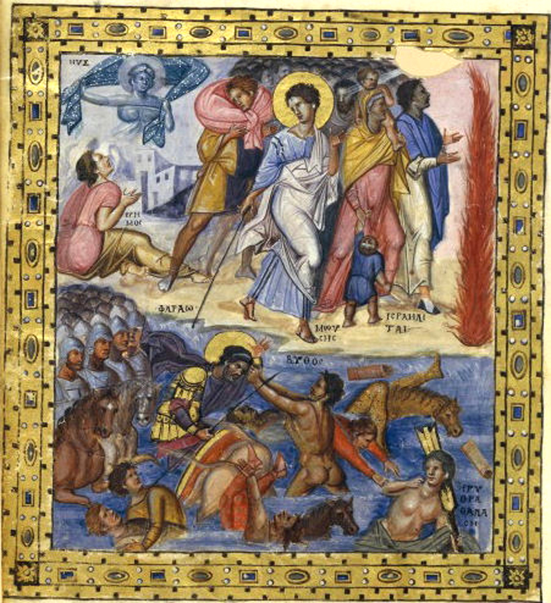 Crossing of the Red Sea, from Art in the Christian Tradition, a project of the Vanderbilt Divinity Library, Nashville, TN. https://diglib.library.vanderbilt.edu/act-imagelink.pl?RC=58768 [retrieved April 16, 2024]. Original source: https://commons.wikimedia.org/wiki/File:Paris_psaulter_gr139_fol419v.jpg.