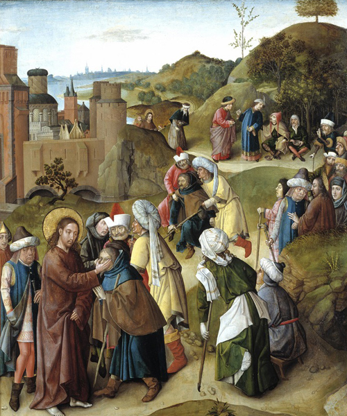 Healing of the Blind Man at Jericho, from Art in the Christian Tradition, a project of the Vanderbilt Divinity Library, Nashville, TN. https://diglib.library.vanderbilt.edu/act-imagelink.pl?RC=56661 [retrieved October 23, 2024]. Original source: https://commons.wikimedia.org/wiki/File:MCC-41326_Genezing_van_de_blinde_te_Jericho_(1).tif.