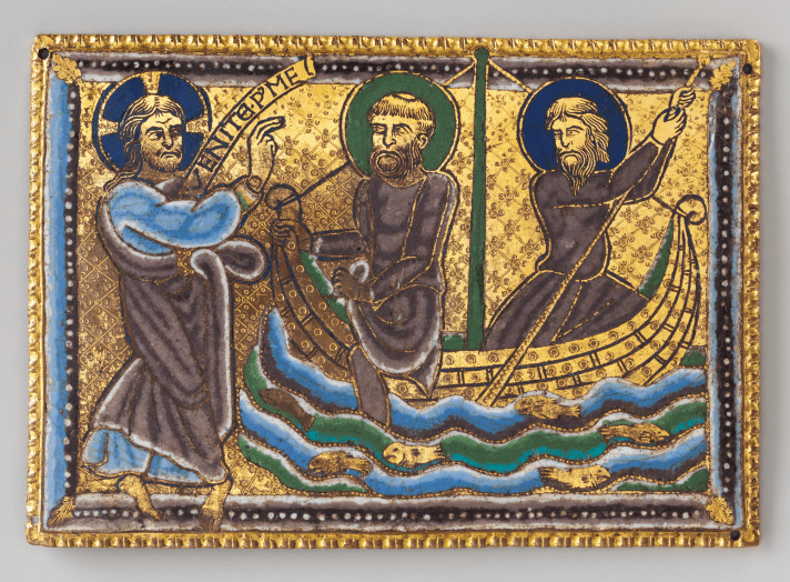The Metropolitan Museum of Art, New York City. Plaque illustrating the Calling of Saints Peter and Andrew, British, ca. 1160-80, Champlevé enamel on gilded copper. Public Domain, Open Access.
