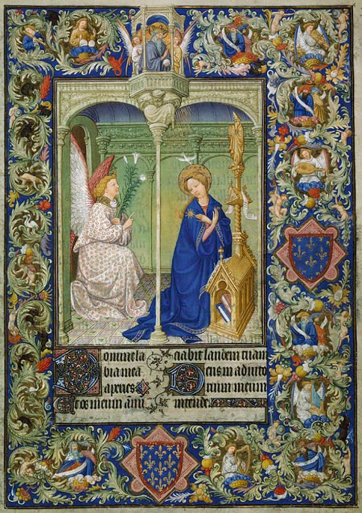 Annunciation to Mary, from Art in the Christian Tradition, a project of the Vanderbilt Divinity Library, Nashville, TN. https://diglib.library.vanderbilt.edu/act-imagelink.pl?RC=54948 [retrieved January 1, 2024]. Original source: http://commons.wikimedia.org/wiki/File:Belles_heures_jean_duc_de_berry_annunciation.jpg.