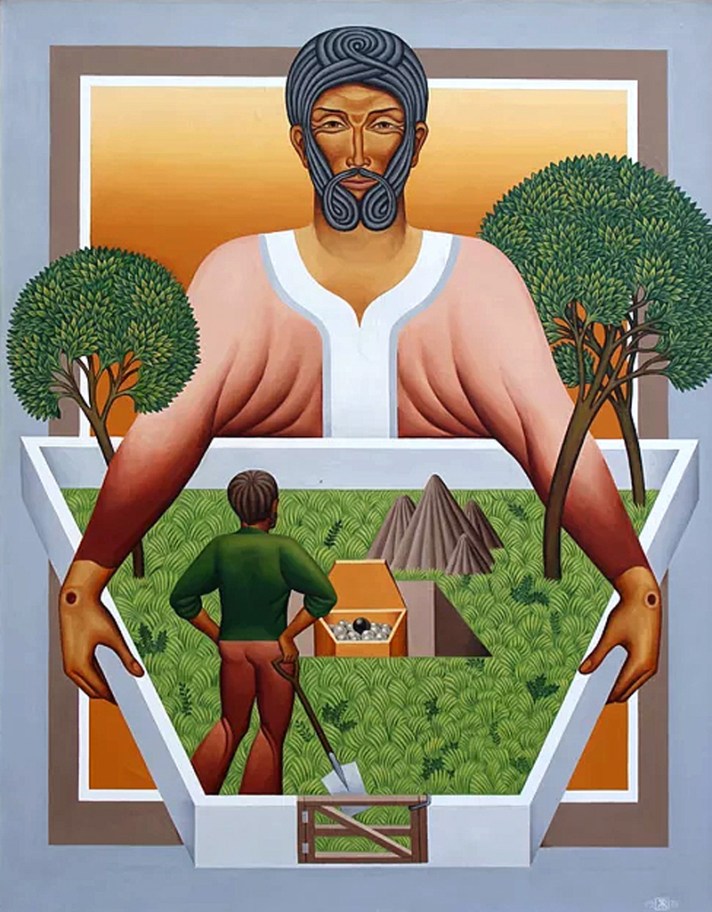 Koenig, Peter. Treasure in the Field, from Art in the Christian Tradition, a project of the Vanderbilt Divinity Library, Nashville, TN. https://diglib.library.vanderbilt.edu/act-imagelink.pl?RC=58507 [retrieved July 31, 2023]. Original source: Peter Winfried (Canisius) Koenig, https://www.pwkoenig.co.uk/.